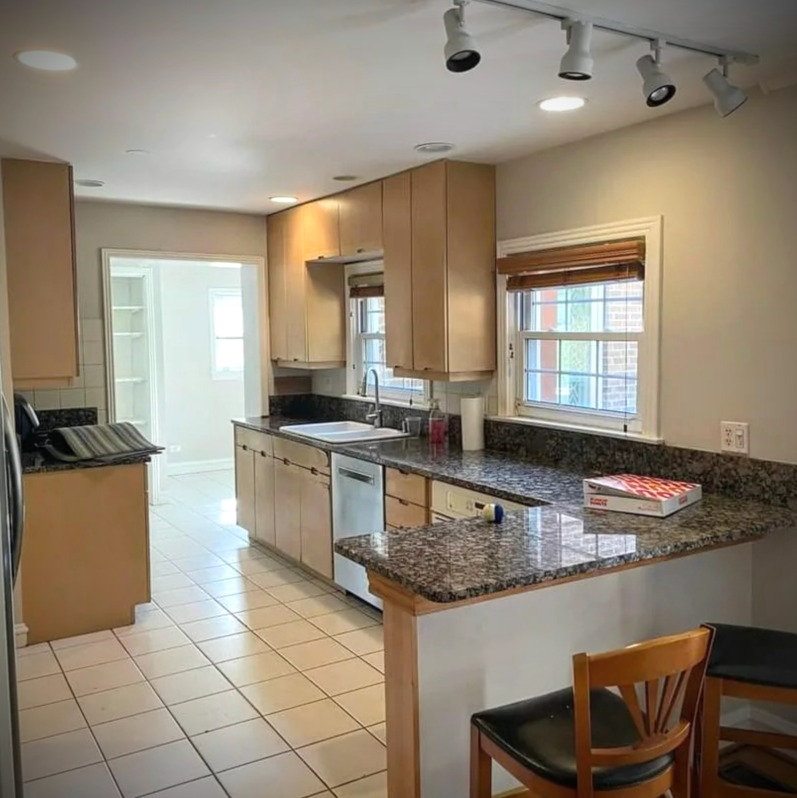 Before - Dark granite countertops, space cut in two with counter penninsula, and overhead track lighting.